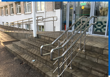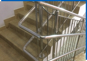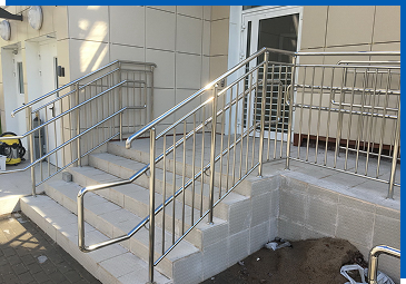 Для безопасности и удобства передвижения пандусы оборудуются поручнями из нержавеющей стали высотой в 700 и 900 мм и диаметром в 38, 42 или 51 мм, а также нижним ограничивающим рейлингом на высоте в 100 – 150 мм. Используются цельнозамкнутые поручни, их начало и конец в обязательном порядке имеют закругленную травмобезопасную форму и выступают за крайнюю стойку на 300 мм.