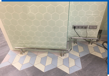 Стекло может быть заматированным полностью, частично или в виде любого рисунка, в том числе с вашим логотипом. Также на стекло можно наклеить пленку, цветную и/или с печатью. Сырое стекло травмоопасное и в перильных ограждениях не применяется.